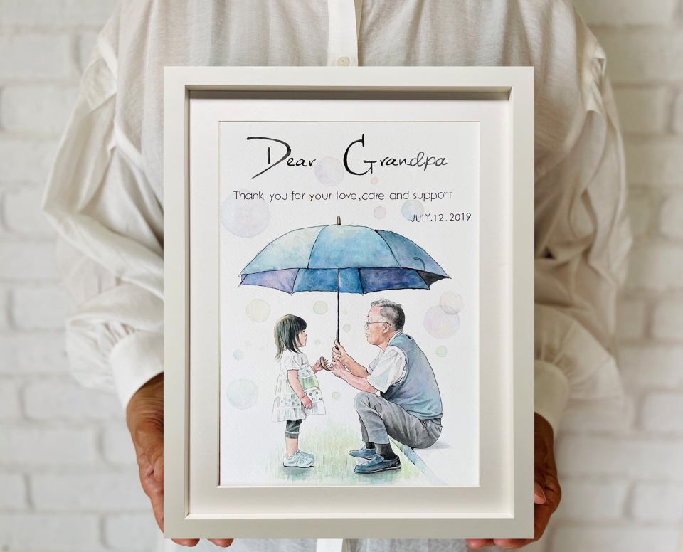 笑顔を大きく描きたい方や、1名以上で描きたい方におすすめなサイズです。Mサイズ〜は画像をお送りいただければ、思い出の風景や小物も一緒に描けます。